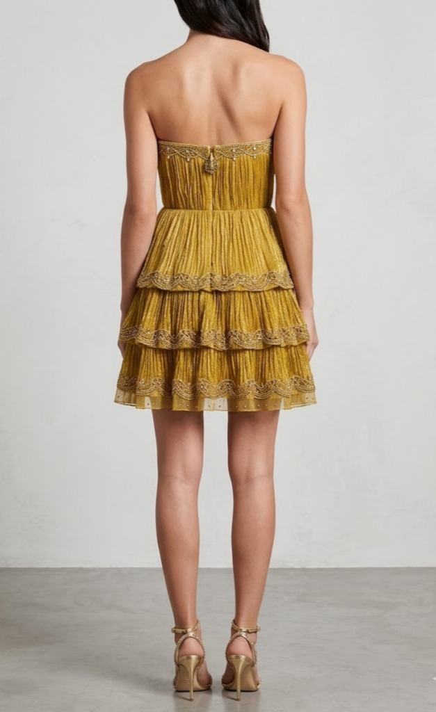 • The Silhouette: A structured sweetheart neckline provides a feminine frame for the collarbones, while the tiered, flounced skirt adds playful volume and movement.