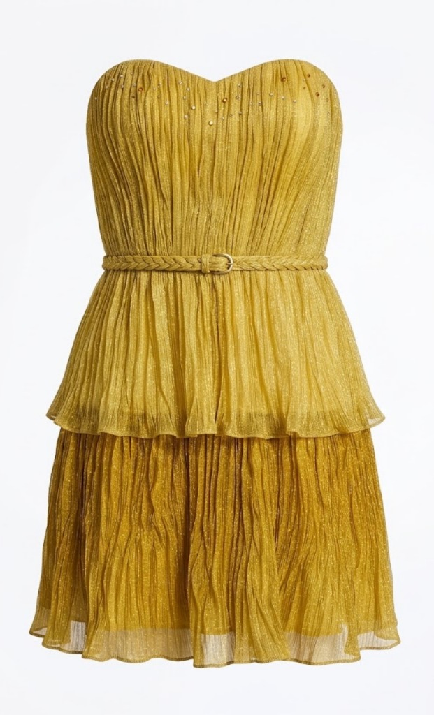• The “Minimalist” Approach: Since the gold plissé is so bold, skip the necklace. Opt for gold hoop earrings and a simple “lived-in” leather clutch to let the dress be the star.