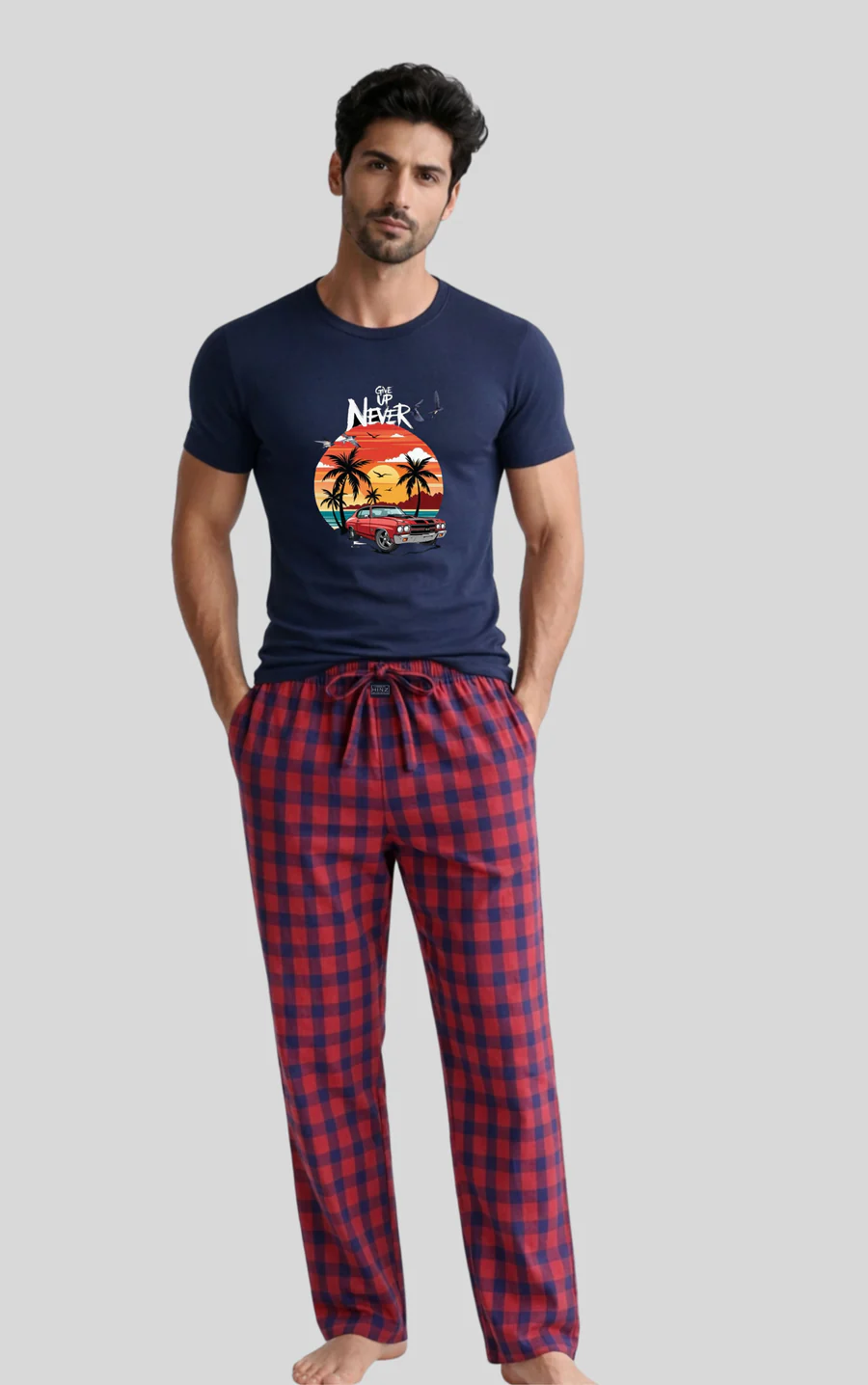 Relax in style with this men’s navy graphic T-shirt and red checked cotton pajama set. Made with soft single jersey cotton shirt fabric and breathable 100% cotton trousers, offering comfort and durability.